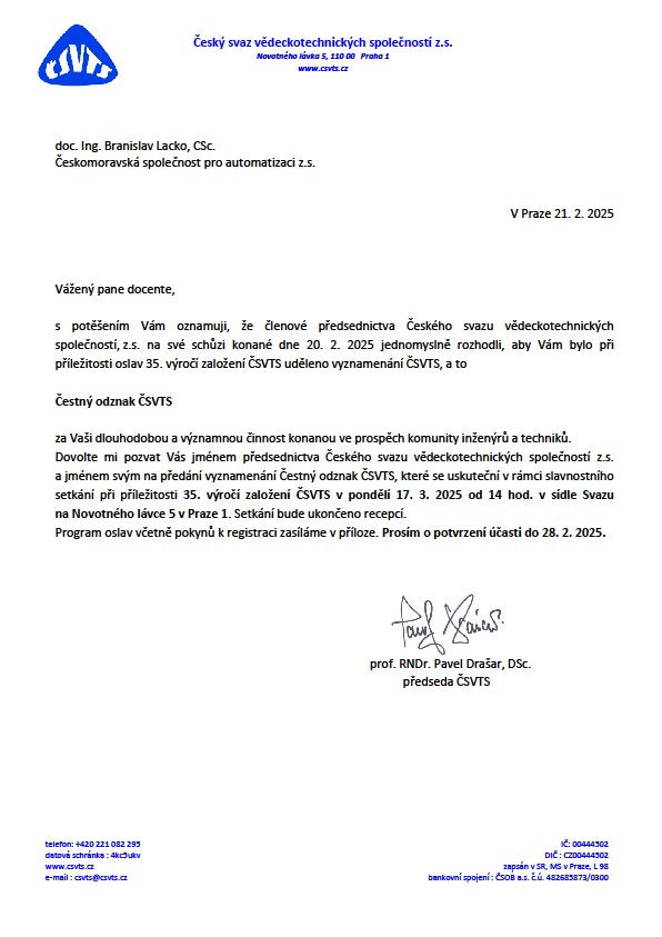 Čestný odznak ČSVTS za práci ve výborech ASI a ČMSA. Předán 17.3.2025 (viz příloha)